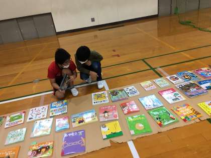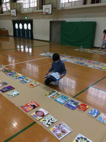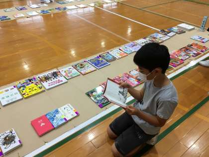 場所は体育館。たくさん並べられた,ぴかぴかの本の中からお気に入りの本を選びました。