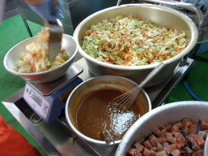 (2)下味をつけたサケ,野菜,みそを合わせた調味液を用意できました。