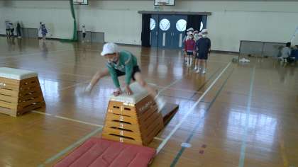 体育科では,「とびばこあそび」の学習をしています。子どもたちは,「やったー!5段の縦開脚跳びができた!」「5段の台上前転が上手にできた!」と言って,「跳び乗り・跳び下り」「横開脚跳び」「縦開脚跳び」など様々な技にチャレンジしています。今後の体育科の学習でも,子どもたち同士で学び合いながら,安全第一に取り組んでいきたいと思います。