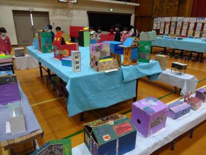 立体作品では,「くみたててできたよ」で作った動物や建物,乗り物などダイナミックな作品ができました。「世界一大きなお城」や「オシャレな鳥」などいろいろな工夫が見られる作品ばかりです。