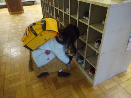 校門をくぐって登校したら,児童玄関で上靴に履き替え,教室に入ります。今日は,雨が降っていたので傘も児童玄関前できれいにたたんでいました。