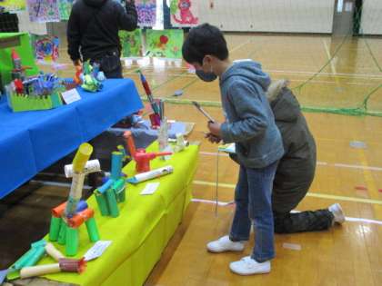 大空学級で,出展したのは,版画「丑」と「だるま落とし」です!自分たちの作品はもちろん,他の学年の作品を見て,お気に入りの作品をどんどん書いていく子どもたちでした。いいなと思った作品を見つけると「ねえ!これ見て!」と近くの友だちや先生にすぐに共有しにいく姿もたくさん見られていい鑑賞の時間になったと思います!