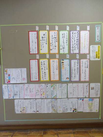 5月の憲法月間を前に,全校でみんなが気持ちよく安心・安全に学校生活を送るために自分の学級では,どんなことができるかな。」「どんなことをしたらいいのかな。」という『スマイル目標』を考えました。1年間を通して,スマイル目標に向かって取り組んでいきます。