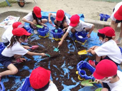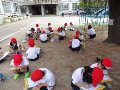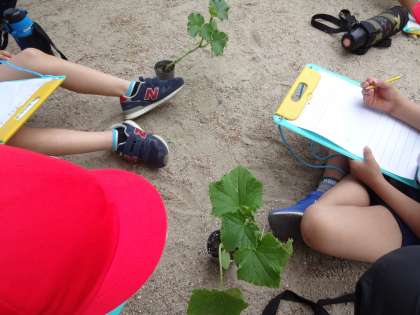 学年では,キュウリ・ナス・ピーマン・オクラを花壇で育てます。