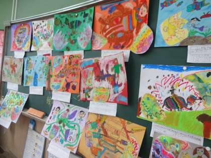 図画工作科では,ふしぎなたまごの色をふしぎな色や模様を描きました。