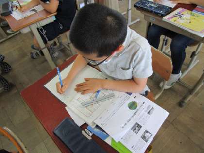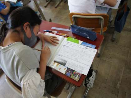 写真左:学習を終えた感想をノートに書いています。
