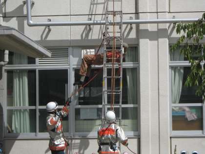 今回は,救急隊の皆さんによる逃げ遅れ教員の救助の様子を見せてもらったり,消火器の使い方を実習したりしました。
