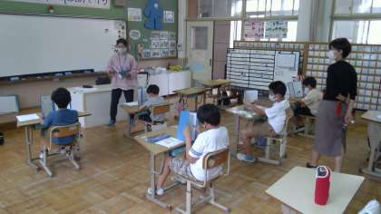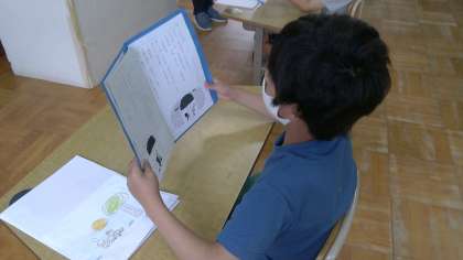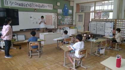 国語科では,「ゆうだち」のお話を読み進めています。「うさぎさん」と「たぬきさん」が夕立の雨宿りをきっかけに,けんかの仲直りをしていく様子を読み取っています。本来,参観日の予定でした,6月3日(木)の学習では,子どもたちは「うさぎさん」と「たぬきさん」の想いをセリフにして,とても上手に発表しました。