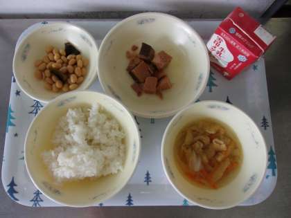 こんぶ豆はスチームコンベクションオーブンで調理しました。今日は純粋な和風献立ですが,子どもたちにとっては,馴染みにくい献立のようです。なま節や大豆などもさもさとした感じがあり,暑い気候の時には少し食べにくい様子でした。