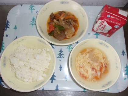 カレーのスパイスが効いて,食欲をそそります。子どもに「どうして和風なの?」と聞かれ,「けずりぶしでおだしをとって,煮ているからだよ。」と答えました。