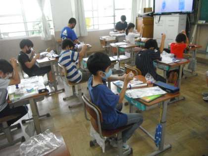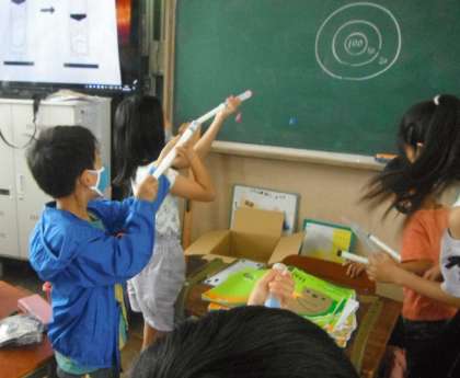 その後,黒板に的をかいて,的に向かって空気でっぽうをしました。うまく的にあたると喜んでいました。