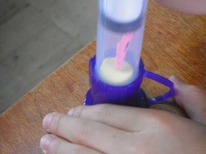今日は,空気の入った筒をおすとどうなるかの実験をしました。筒の中にチューリップの形をしたスポンジを入れました。そして,上から押すと何とチューリップが小さくなりました。押すのをやめると,チューリップが元の大きさに戻りました。子ども達は,興味をもって楽しく学習をしていました。
