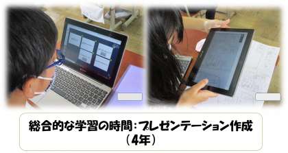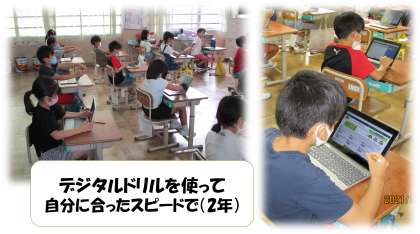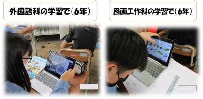 今年度になって,全学年がGIGA端末を活用して学習を進めています。GIGA端末を活用することで,子どもたちが意欲的に学習に取り組むことができています。デジタルドリルを使った学習は,一人学びに最適でどんどん自分で学びを進めています。また,高学年になると,ロイロノートを使って,自分の考えや意見をまとめて発信することができるので,「自分の考えを伝えたい」と積極的に学習に取り組む様子を多く見ることができるようになりました。自分や友だちの考えや意見を可視化できることで,友だちと意見を共有したり,比較したりして,さらに自分の考えを深めることができているようです。