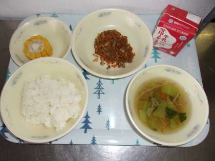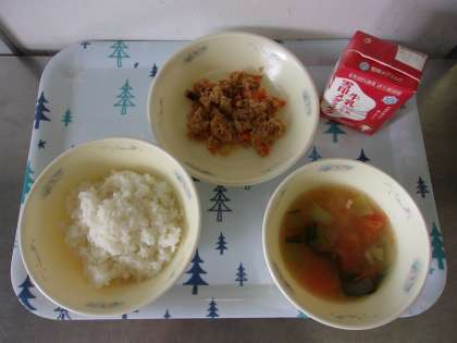和風ドライカレーの具はごはんに混ぜて食べます。カレーのスパイスがよく効いて,今日もごはんがよく進みます。ドライカレーにはごぼうやこんにゃくを使っていて,噛み応えのある献立です。