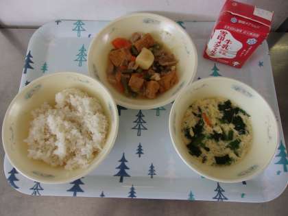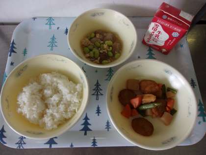 平天の煮つけは子どもたちが大好きな献立のひとつです。自分の食器に平天が4つあった,5つあったと喜んでいました。揚げ里芋のあんかけは,だしの旨味がきいたそぼろあんとからんでとてもおいしく食べられたようです。