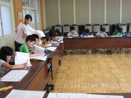 最後に,検定です。できたら3人の学生ボランティアに分担して採点してもらいました。練習の成果もあって,ほとんどの子どもが合格しました。惜しかった子どもも解答を見て,やり直していました。