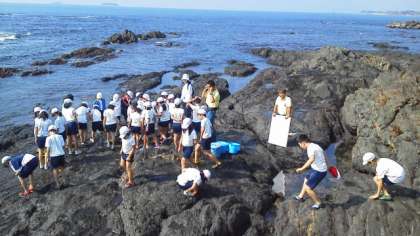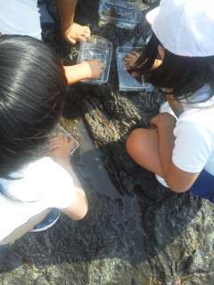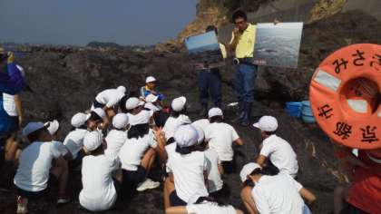 子どもたちは,道中の疲れも忘れて磯観察を始めます。その前に,明日見学するマリンランドの職員の方から,観察の仕方や海の生き物について基本的な説明を受けました。
