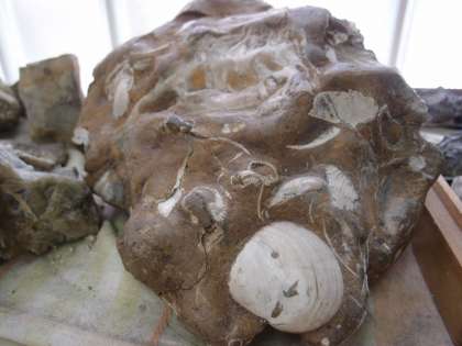次に,6年生の子ども達が手にとって見ているものは,ただの石…ではありません。よく観察してみると白い貝殻のようなものや葉のようなものが!そうです,これは貝殻や葉の化石で約100万年前のものだそうです。山で発見されたと言うことですが,貝殻が見られることからそこは昔,海だったということが考えられます。