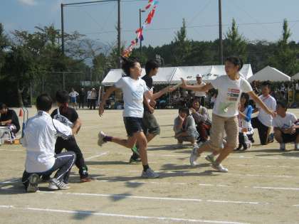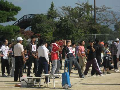 リレーボールや球拾いリレーなど,区民運動会ならではの種目があります。大人も一生懸命です。