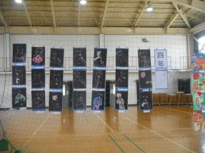 4年生は,彫刻刀を使って版画「リコーダーをふいている自分」の作品を展示しました。彫刻刀をはじめて使ったので,ていねいに彫っていました。彫ったところの裏から絵の具で色をつけました。版画絵の具の黒に彫ったところの白,絵の具で色をつけたところの色をつけて仕上げました。