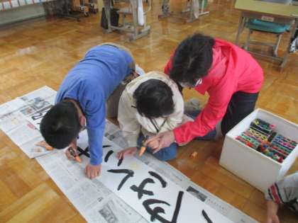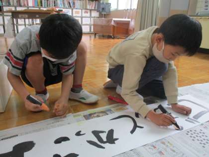 大空学級の今年の学級目標は,「ビシッと かっこよく やさしい 大空学級」に決まりました。勉強などやる時はビシッとかっこよくやる,でも優しい気持ちは忘れずに,という気持ちを込めています。「どんな大空学級がいいかな?」と,全員でそれぞれ意見を出し合い,考えました。文字は筆で,全員の字を入れました。写真は,今年なりたい姿になった自分の絵を描いている様子です。