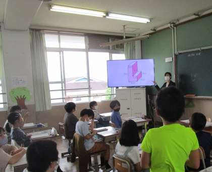 直方体や立方体の体積を求める学習から,複雑な立体(L字型)の体積を求めていきました。