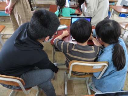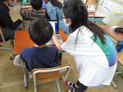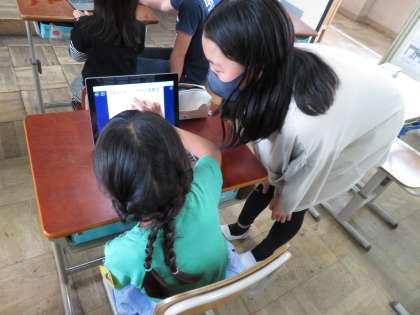 電源のつけ方や消し方,ロイロノートの使い方などについて,見本を見せながら優しく説明する姿が見られました。