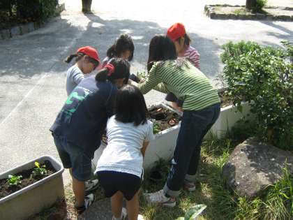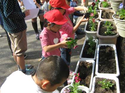 ストック・ナデシコ・スノーボール・ビオラの苗には,可愛い花がたくさん付いています。子どもたちは,教えてもらった通り,丁寧に花壇に植えました。2年生が1年生にやさしく教えている姿も見られました。苗を入れる穴が小さいので,深く掘るのを手伝ってあげていました。植えた後,お水をたっぷりあげて出来上がりです。
