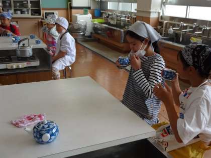 一人一回は,ガスコンロに火をつける経験をしました。押しながら回すことが難しかったようです。また,火の大きさを調節することやガス漏れがないかを点検するなど使い方を知りました。その後,お湯を沸かしてお茶を入れてを飲みました。「お茶を入れるのにこんなにたくさんすることがあるんだなとびっくりしました。」という感想を書いていました。「またお家でもお茶を家族に入れたい。」「香りがとてもよかった。」と色々な感想を聞くことができました。