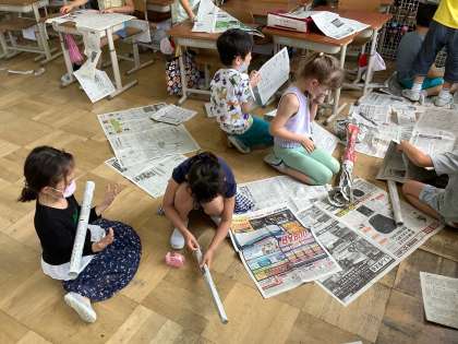 思いつくがままに,新聞紙でいろいろと作りだしていました。
