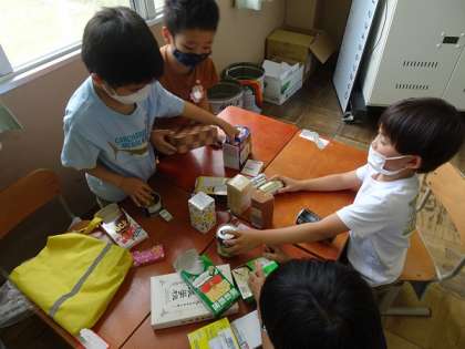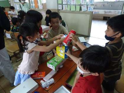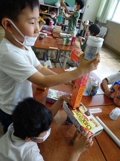 算数科の学習で,おうちから持ってきた箱や空き缶を使って,
