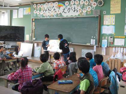 今日は,1〜2年生の各クラスと大空学級で「読み聞かせ 出張版」を行いました。図書委員が選んだ絵本を低学年の子どもたちに読んで聞かせました。