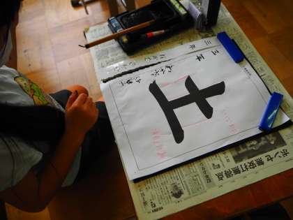 「始筆の入り方を力強く入ろう」「よこ画の長さに気を付けて書こう」「たて画を真ん中に書こう」など、お手本には,自分の「たいせつ」をメモしながら作品づくりに取り組みました。最後には、自分の書いた二つの作品をじっくりと吟味している子たちの姿も見られました。「トン・ツー・ウン」を合言葉に、力強く、緊張感の伝わる作品ができました。