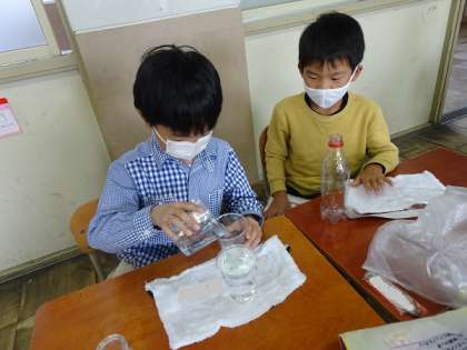 算数科の「おおきさくらべ」の学習で,入れ物のかさを比べました。