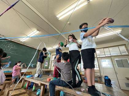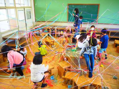 今日は図画工作科「ひもひもワールド」の学習で、様々な種類のひもを結んだりつなげたり組み合わせたりしながら、おもしろい世界を創造していきました。ひものつなげ方を工夫し、試行錯誤しつつわくわくしながら取り組んでいる姿が印象的でした。活動を進めていく中で、自然と友だちとのつながりも生まれ、みんなで一つの世界を創り出す楽しさを味わっている様子でした。はじめさみしい様子だった図工室も、最後にはまるで森のような、ジャングルのような、フェスティバルのような世界の広がる教室となりました。