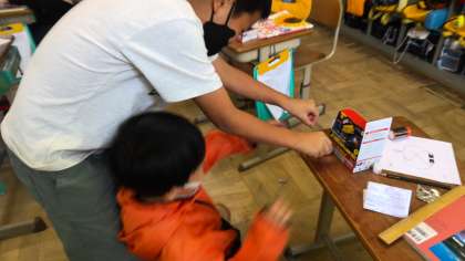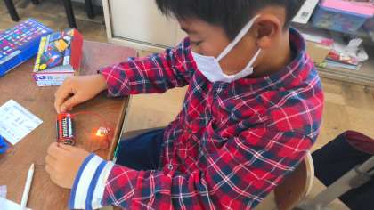 今日の理科「電気の通り道」の学習では、豆電球とソケット、そして乾電池を使って,どのようにすれば電球に明かりがつくのかを考え、どのようにつながっているのかをいろいろ予想しました。いろいろ試しでみて、「あっ!ついたついた!」「そんなつなぎ方では絶対つかないとおもってた」など、予想したことを確かめながら活動を楽しんでいる様子でした。