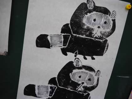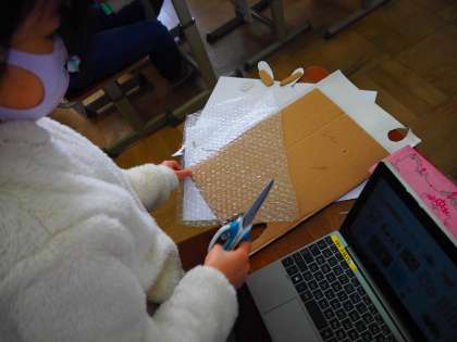 図工の学習では、様々な材料の感じをいかしながら、思い思いに想像する動物の姿を表現していきました。普段身近にある画用紙や段ボール、なみなみの段ボールや緩衝材などにインクをつけて紙に写し出してみると、それぞれ違った感じになり、子たちもはんを作ったり写し出したりする活動を楽しんでいる様子でした。これからどのような世界が広がっていくのか、楽しみです。