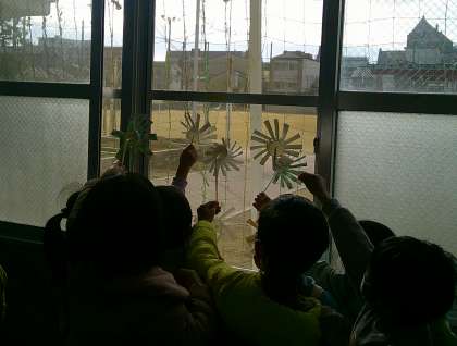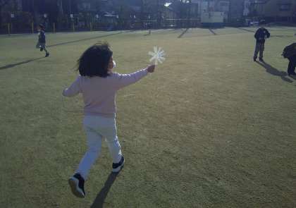 紙コップで作った風車を回そうと、風と一緒になって走ったり、教室の窓から風を呼び込んだりしました。