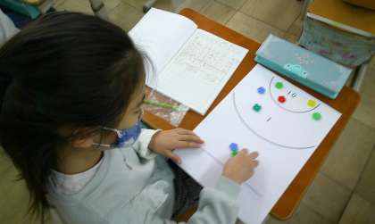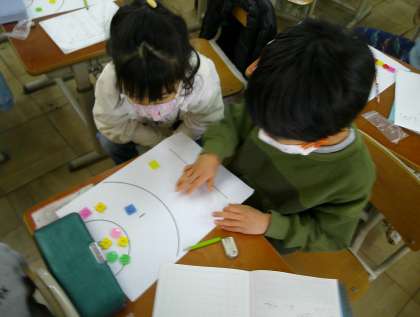 算数科の学習でおはじきいれをして、点数比べをしました。