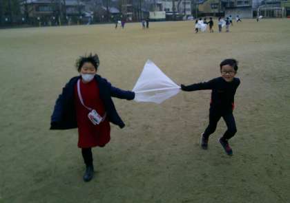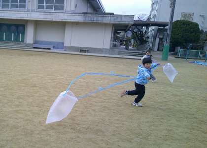 大きなビニール袋をもって風を集めたり競走したりしているうちに、ビニールのロープをつけて凧のようにし始めました。