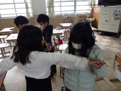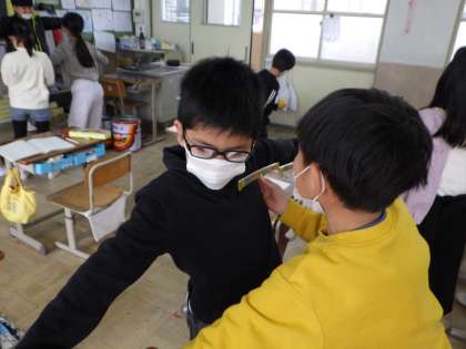 調べた自分の両手の大体の長さから、黒板の横の長さを頑張ってはかりました。