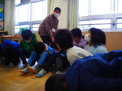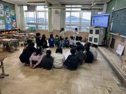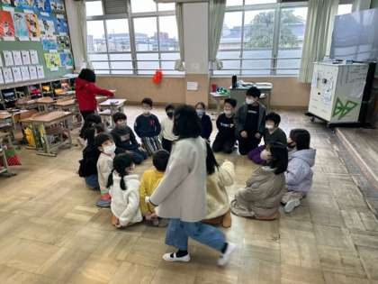 今日の中間休み、楽しみにしていたみんな遊びも雨のため、室内で活動を行いました。1組も2組もあそびがかりさんが教室の中で行えるハンカチ落としを考えて、実施してくれており、あいにくの雨を吹き飛ばすような元気な声が教室中に響き渡っていました。