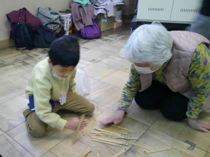 今日は、昔遊びの名人として女性会や老人会の方に来ていただいて、