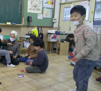 生活科の「ふゆをたのしもう」の学習で、昔遊びに挑戦している子どもたち。
