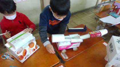 図工展で展示する予定の「はこでつくったよ」、一人ずつの作品が仕上がってきました。