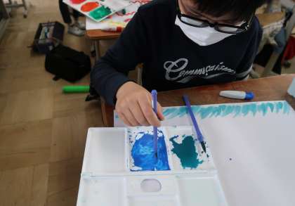 水彩絵の具と水でいろいろな色を作ったり,筆の使い方を工夫したりする中で
