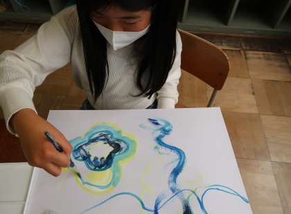 図画工作科では,「絵の具+水+ふで=いいかんじ」の学習をしています。