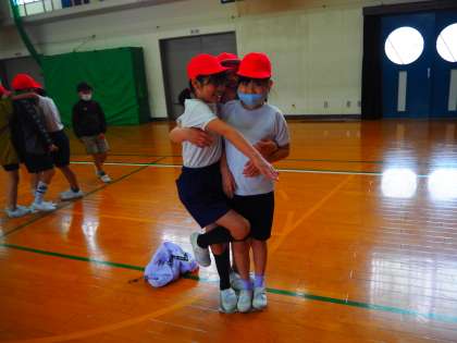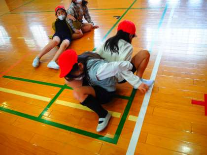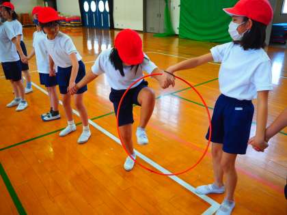 体育科「体ほぐしの運動」の学習では、友達と一緒にストレッチをしたり、みんなで協力してフラフープをくぐる活動に取り組んだりして、体も心も気持ちがよくなる活動に取り組みました。ふりかえりの場面では「楽しい」という言葉がたくさん聞かれました。どうして「楽しい」のかをよく考えてみると、何か大切なことに気付けるかもしれませんね。