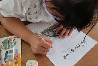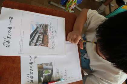 写真に印をつけ,そこから線を結びながらまとめる姿も。