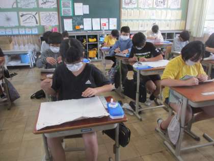 「思いを形にして生活を豊かに」の学習では,修学旅行に向けてナップサック作りをしています。前回は布にチャコペンシルで印をつけましたが,今日は脇のしつけ縫いをしました。布地を待ち針で留めたり,テープをはさんだり,針の扱いに気を付けながら難しいところも一生懸命取り組んでいました。
